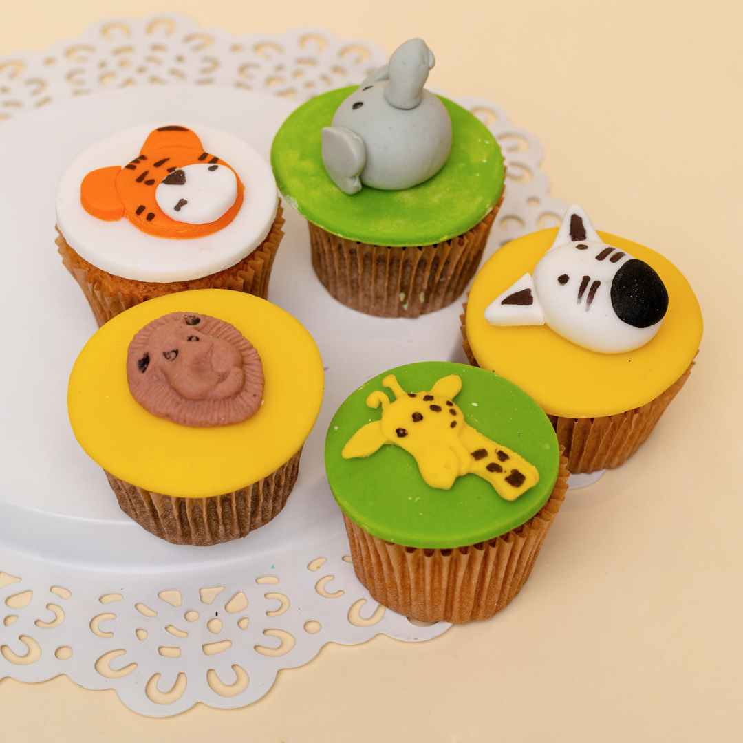 تخيلي الترابيزة مليانة كب كيك عليها وجوه الحيوانات الكيوت – الأسد المرح، الزرافة اللطيفة، القرد الشقي